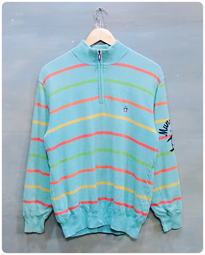 [M] 먼싱웨어 골프 로고 스트라이프 반집업 울 니트